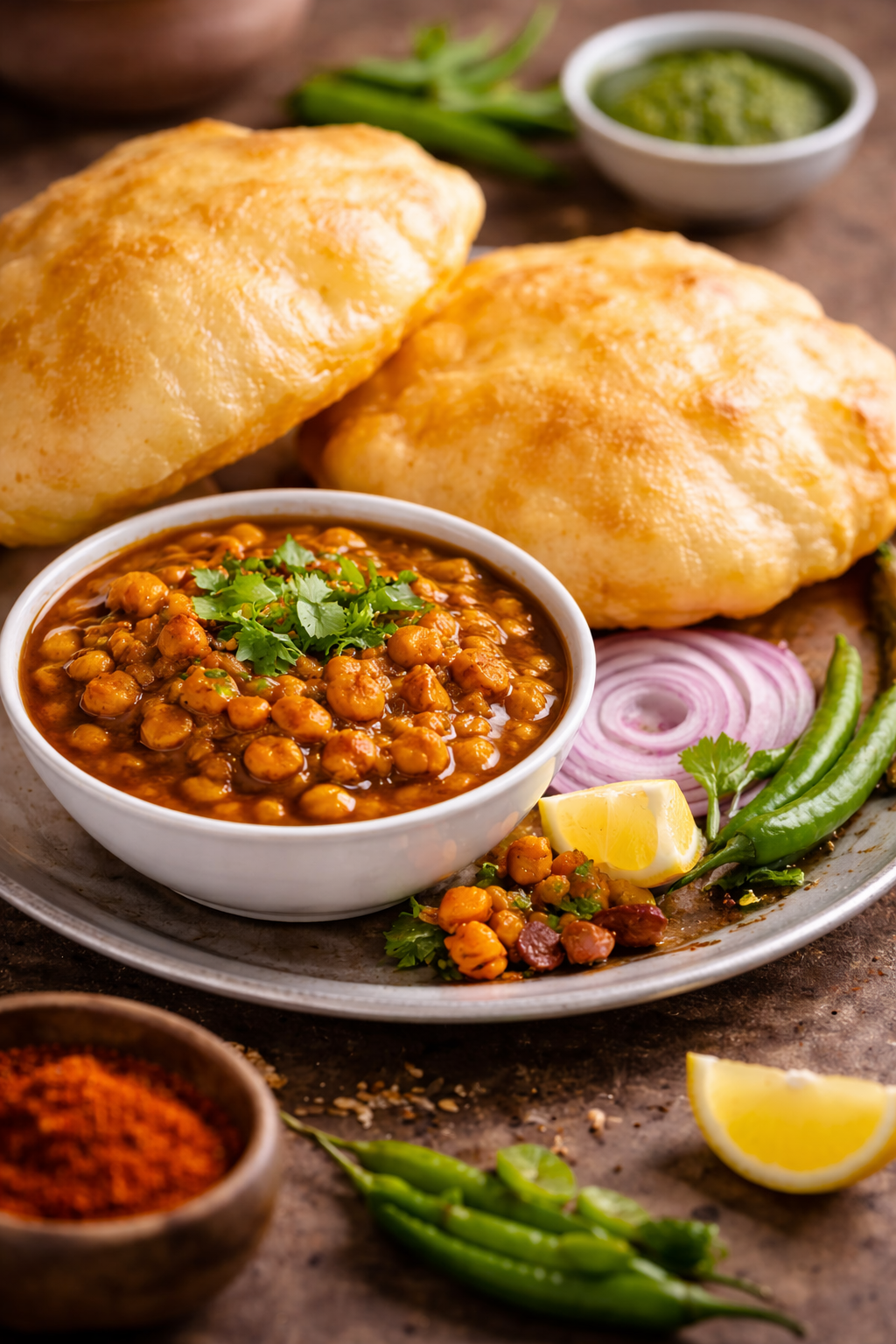 Chole Bhature is a legendary North Indian comfort dish that brings together bold spices and indulgent textures. The dish features chole, a slow-cooked chickpea curry simmered in a rich onion-tomato gravy infused with aromatic spices like cumin, coriander, garam masala, and a hint of tangy amchur. Each chickpea absorbs the masala, delivering deep, spicy flavor in every bite.