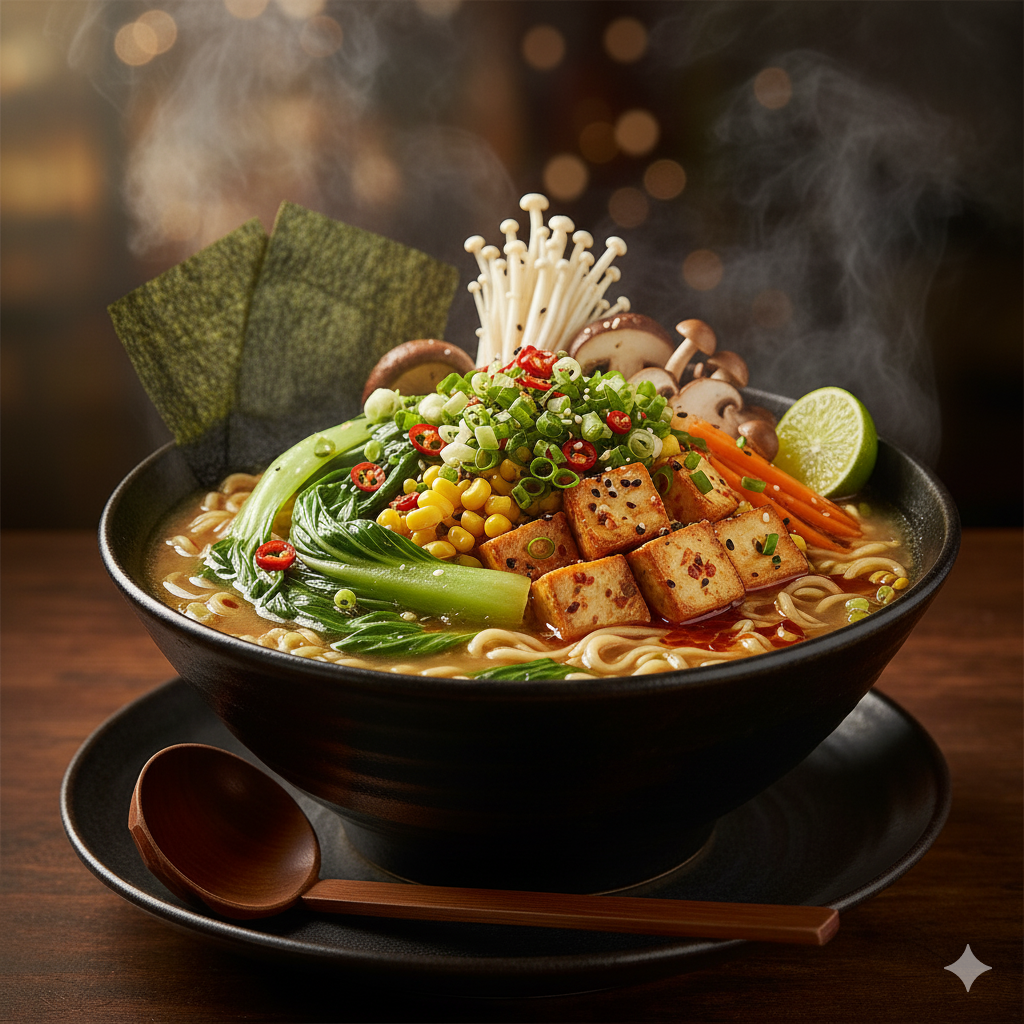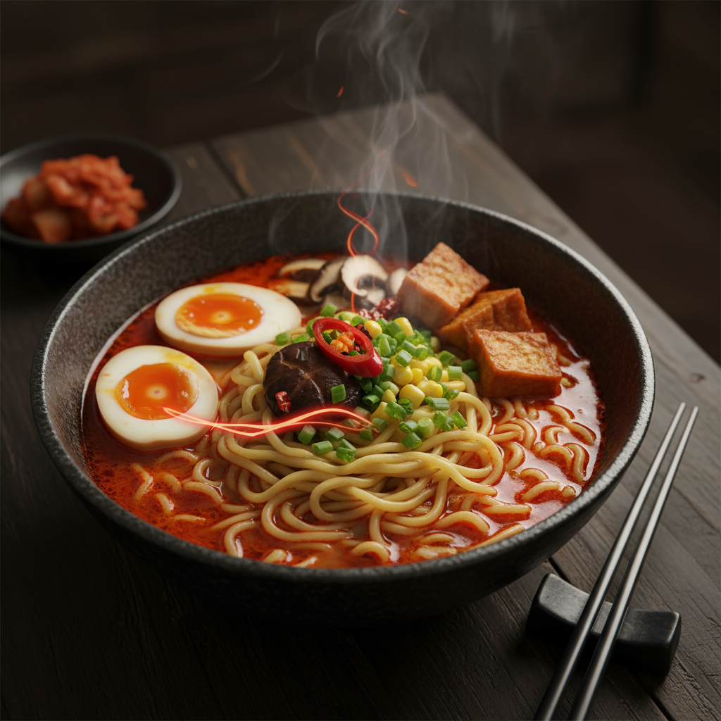 Step into a world of bold flavors with our Devil Veg Ramen, crafted for those who crave a little heat in every bite. This steaming bowl features perfectly cooked noodles swimming in a rich, spicy broth infused with a blend of exotic spices and umami flavors. Fresh, colorful vegetables like crisp bok choy, crunchy carrots, tender mushrooms, and sweet corn add texture and balance to the fiery broth. Topped with spring onions, sesame seeds, and a drizzle of our signature spicy chili oil, every mouthful delivers a perfect harmony of spice, freshness, and heartwarming comfort.